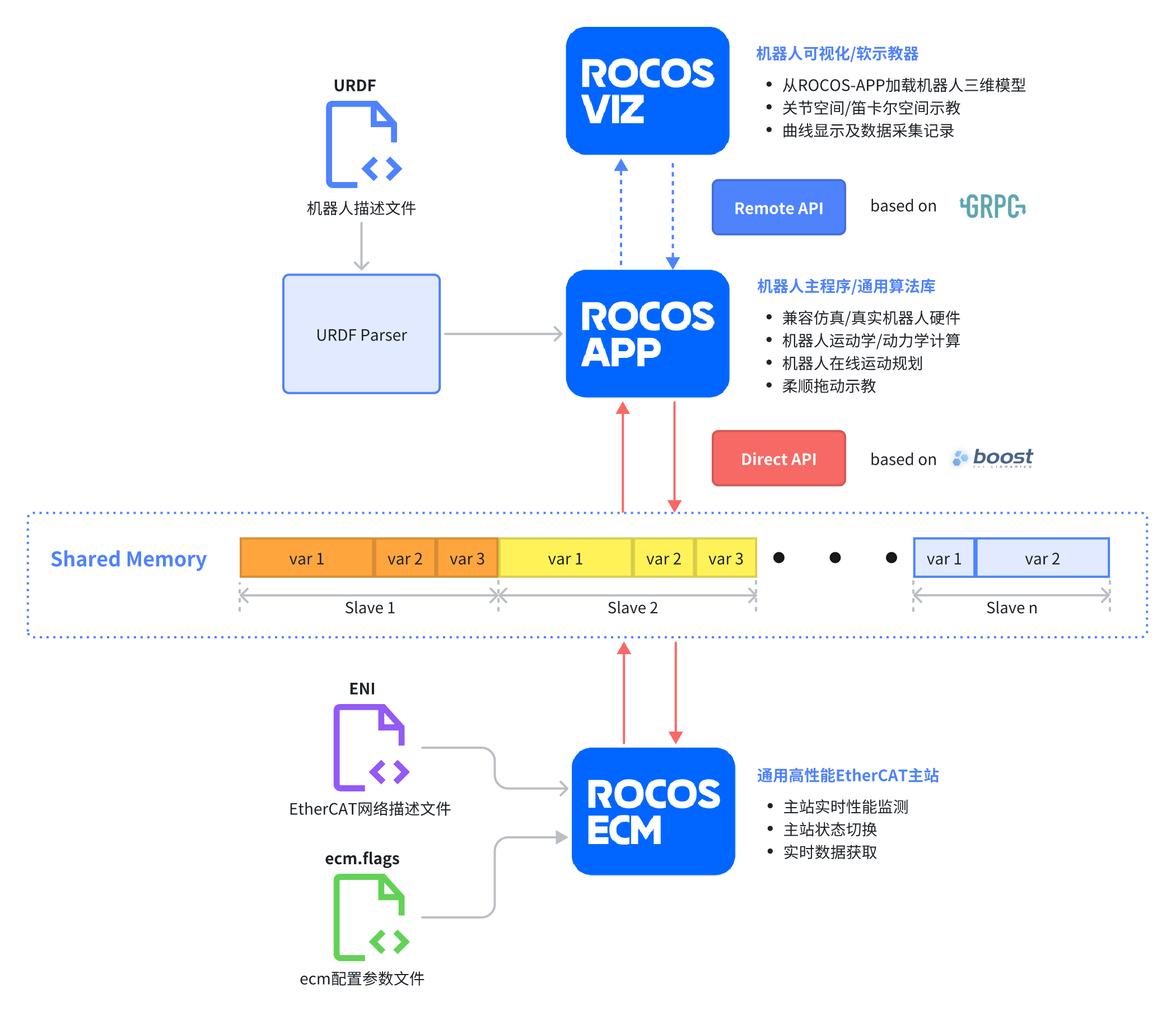- ROCOS-ECM: A high-performance general-purpose EtherCAT master, used for bus data acquisition, which quickly loads network topology configurations via ENI files.
