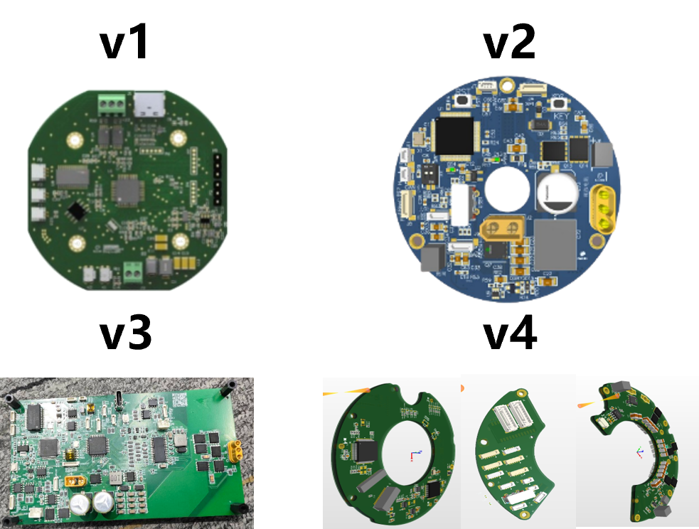 We designed a high-bandwidth compliant servo driver with four iterative versions. From the initial circular prototype (v1) to the modular, split-type design (v4), each iteration optimizes circuit layout, enhances signal integration, and improves mechanical adaptability, laying a solid foundation for high-performance servo control.