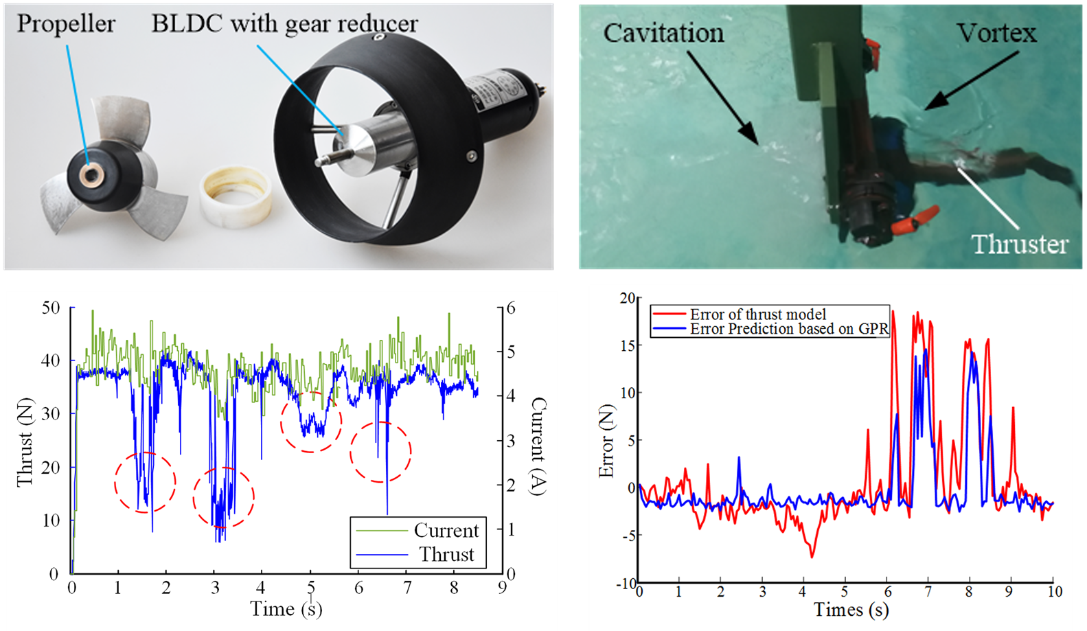 In order to realize thrust prediction under quasi-cavitaition when the underwater thrusters working near water surface, a novel quasi-cavitation thrust prediction approach is proposed. the mechanism of quasi-cavitation is analyzed, and Bayesian estimation based thrust model(BETM) is established to obtains the relationship between thrust, rotation speed and input current. Then, a novel thrust loss prediction model based on Gaussian process(QCTM-GP) is established which considering thrust loss caused by quasi-cavitation, the BETM and QCTM-GP are used to realize quasi-cavitation thrust prediction. The effectiveness of the quasi-cavitation thrust prediction approach is verified via experiments.